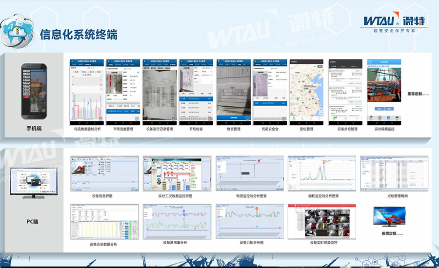 微特起重機(jī)信息化管理系統(tǒng),是在起重機(jī)安全監(jiān)控管理的基礎(chǔ)上結(jié)合中鐵集團(tuán)在運(yùn)架施工管理上的特色而開發(fā)的信息化管理系統(tǒng)。系統(tǒng)集成了視頻遠(yuǎn)程、數(shù)據(jù)遠(yuǎn)程、手機(jī)錄入、拍照上傳、模擬動(dòng)畫遠(yuǎn)程檢測與控制等信息化功能,實(shí)現(xiàn)了高鐵運(yùn)架施工全過程的可視化與網(wǎng)絡(luò)化。