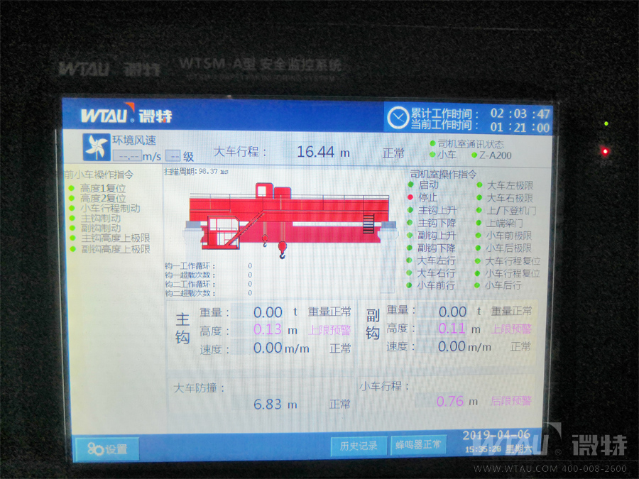 微特WTSM-A型起重機安全監(jiān)控系統(tǒng)具有實時監(jiān)控,動態(tài)顯示,聲光報警,數(shù)據(jù)存儲,斷電記憶以及密碼保護等功能,且儀表本身設(shè)計具有抗干擾性強,操作界面方面,通用性強等優(yōu)點。經(jīng)過微特技術(shù)工程師的現(xiàn)場安裝調(diào)試完后順利通過了客戶及當?shù)靥貦z機構(gòu)的驗收,贏得了客戶的認可,也為我們今后在淄博地區(qū)業(yè)務(wù)的深入開展起到了一個良好的開端。