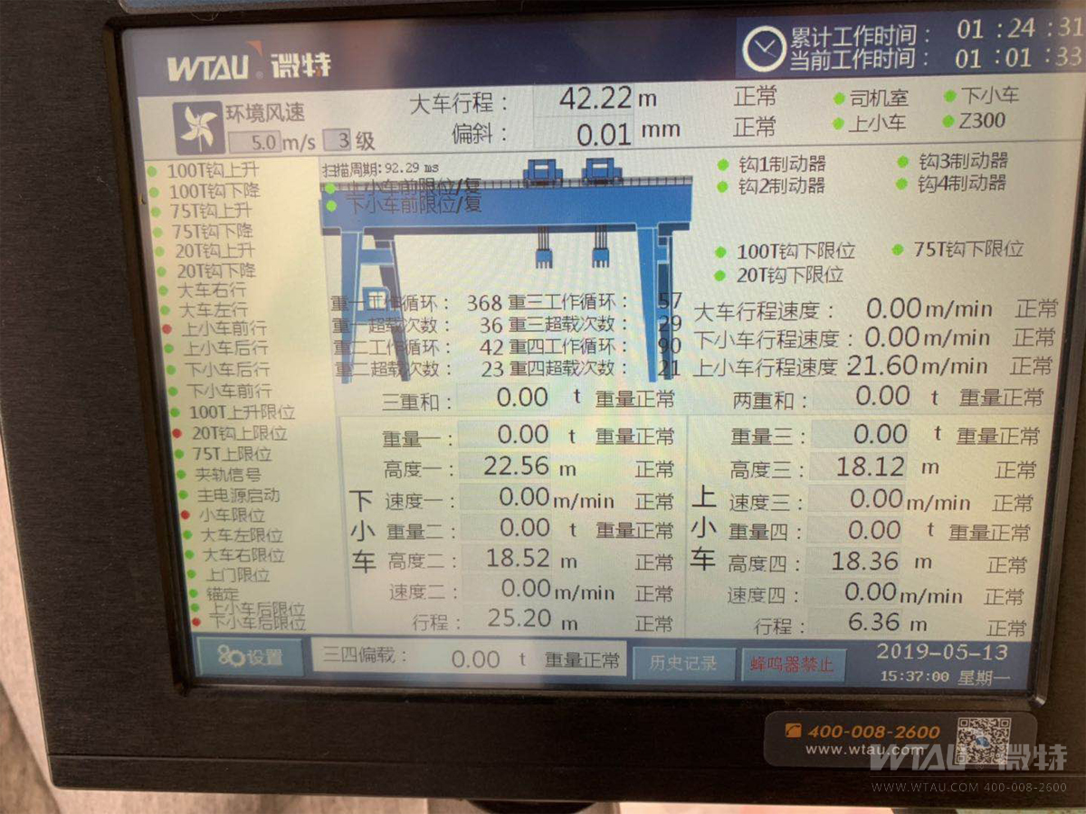 完工后的監(jiān)控系統(tǒng)對(duì)吊點(diǎn)區(qū)域?qū)崟r(shí)監(jiān)控,大車行程全方位在線監(jiān)控,小車形成數(shù)據(jù)行程顯示在儀表界面,達(dá)到各限位點(diǎn)后實(shí)時(shí)監(jiān)控,司機(jī)為我們的監(jiān)控系統(tǒng)點(diǎn)贊