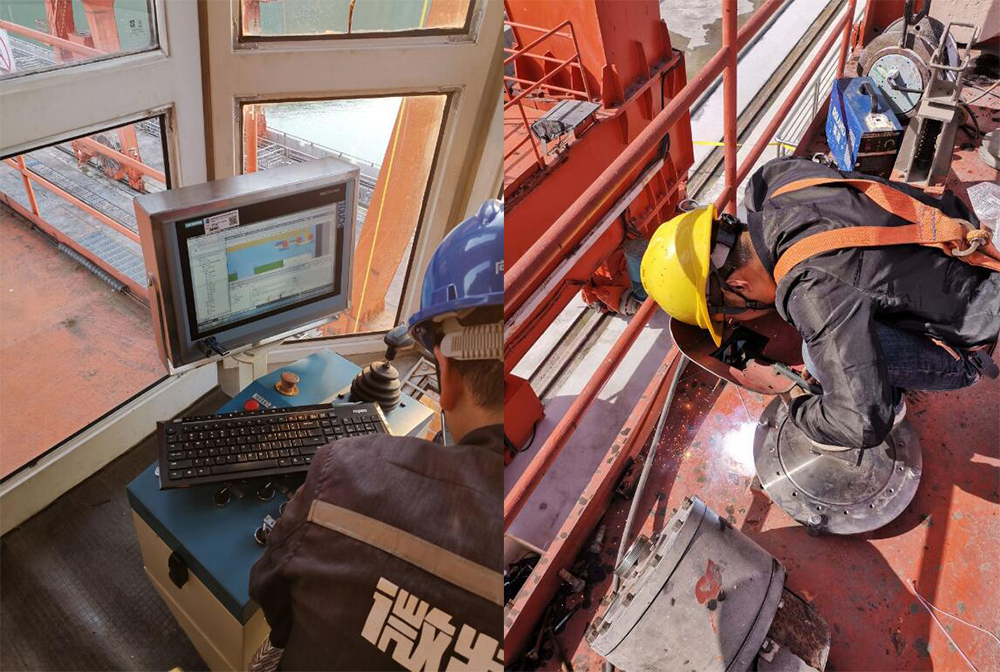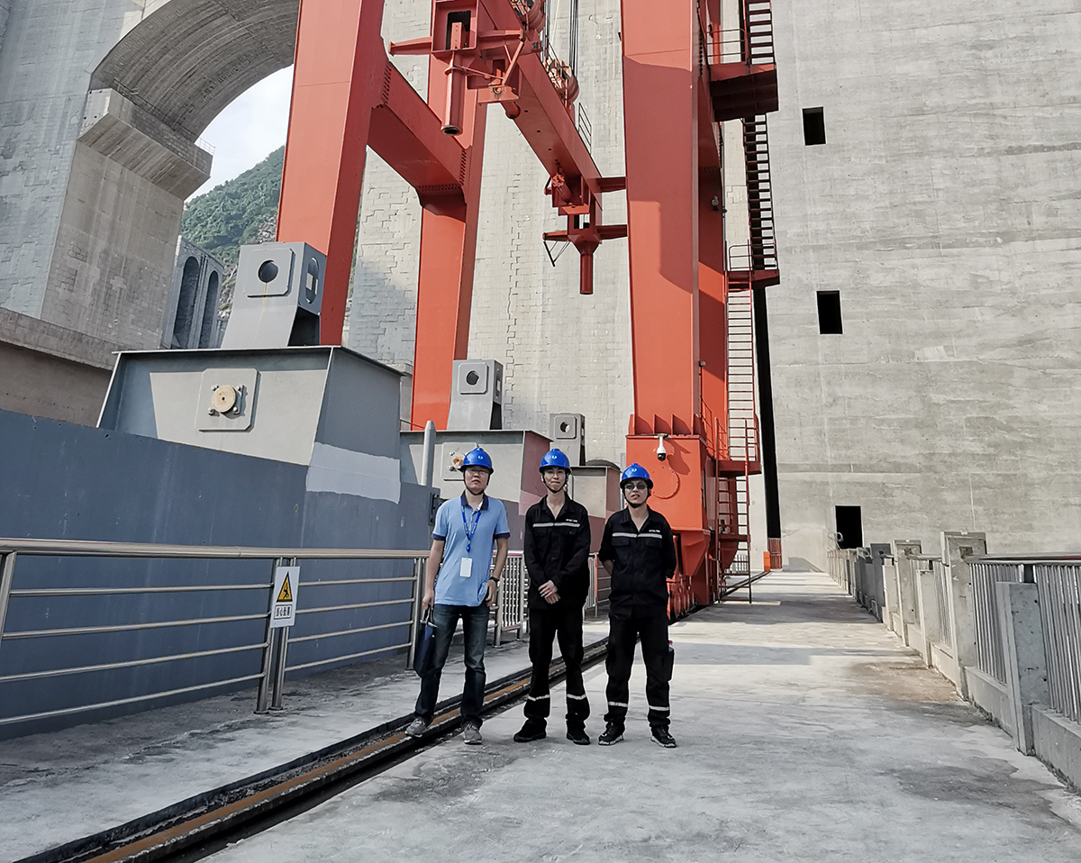 施工過程中,由于尾水門機抓梁不能落到地上,安裝過程中全程都是高空作業(yè),這無疑也加大了施工難度。而且,安裝期內(nèi)恰逢當(dāng)?shù)囟嘤晏鞖猓瑸榱瞬谎诱`工期,售后工程師們時常要冒雨施工。雖然過程中困難較多,但均被一一克服解決,項目有序推進。