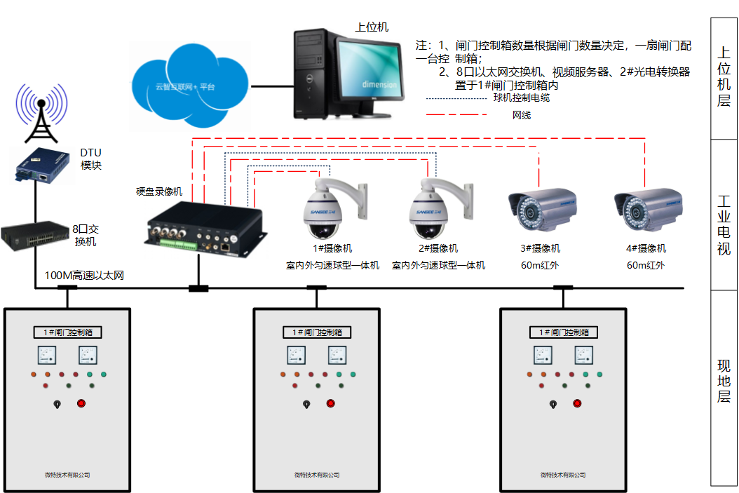 由微特為客戶提供的技術(shù)解決方案,全系統(tǒng)采用4套閘門(mén)現(xiàn)地操作箱和一套可編程控制單元及相關(guān)配套通信設(shè)施。采用可編程控制器控制方式設(shè)計(jì)?,F(xiàn)地控制單元完成對(duì)閘門(mén)的數(shù)據(jù)采集及數(shù)據(jù)預(yù)處理,負(fù)責(zé)通過(guò)網(wǎng)絡(luò)傳送數(shù)據(jù)信息,并自動(dòng)服從上位機(jī)的命令和管理。