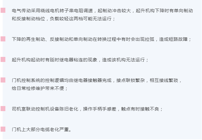 金銀臺樞紐1250T雙向門機電氣控制系統(tǒng)于2012年投運至今已有8年,控制系統(tǒng)元器件老化,部分元器件已停產(chǎn),無法提供備件,控制線路老化,可靠性降低,影響設(shè)備安全運行,無法滿足設(shè)備安全生產(chǎn)的需要。原控制系統(tǒng)設(shè)計性能差,操作系統(tǒng)容易出故障,啟動沖擊較大,平穩(wěn)性差。據(jù)現(xiàn)場調(diào)研主要存在以下問題: