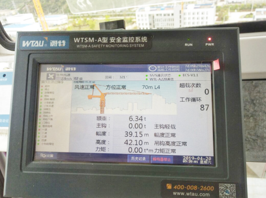 ▲微特WTSM-A型塔機(jī)安全監(jiān)控系統(tǒng)主機(jī)顯示屏