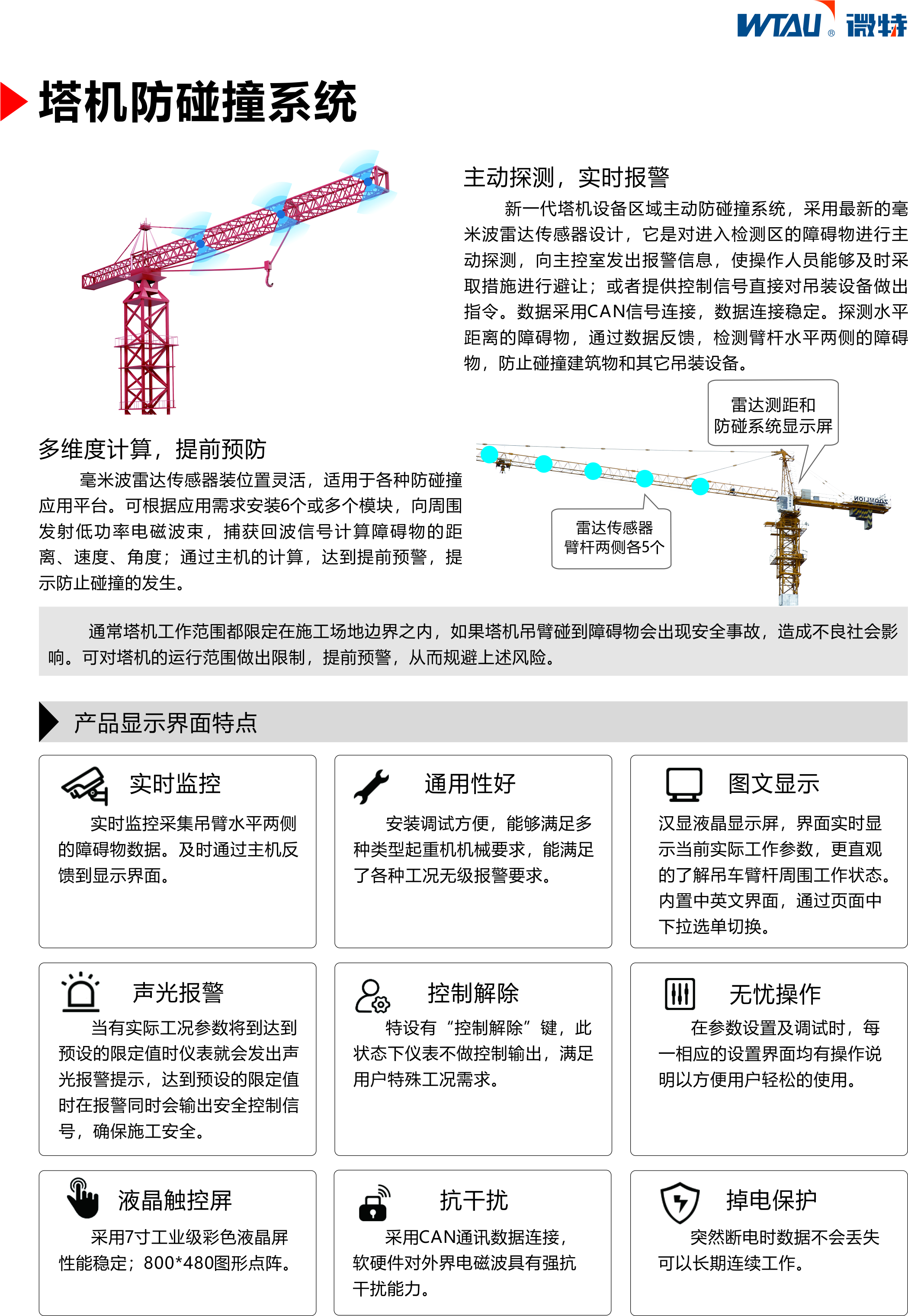 新一代塔機設(shè)備區(qū)域主動防碰撞系統(tǒng),采用最新的毫米波雷達傳感器設(shè)計,它是對進入檢測區(qū)的障礙物進行主動探測,向主控室發(fā)出報警信息,使操作人員能夠及時采取措施進行避讓;或者提供控制信號直接對吊裝設(shè)備做出指令。數(shù)據(jù)采用CAN信號連接,數(shù)據(jù)連接穩(wěn)定。探測水平距離的障礙物,通過數(shù)據(jù)反饋,檢測臂桿水平兩側(cè)的障礙物,防止碰撞建筑物和其它吊裝設(shè)備。
