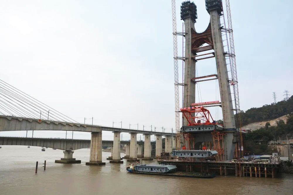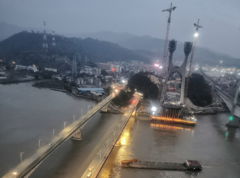 其中烏龍江特大橋位于福州倉山區(qū)和閩侯縣境內(nèi),其下游約220米就是324國道烏龍江公路橋,全長868.188米,跨324國道和烏龍江。本橋為雙線橋,全長868.178米,共計14個墩臺,總投資約1.33億元。該橋采用雙線矩形空心橋臺,主跨為(144+288+144)米部分斜拉橋,為世界范圍內(nèi)同類橋型最大跨度。