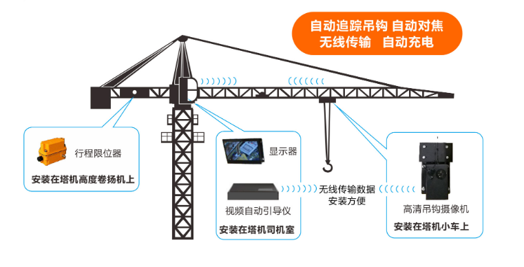 將攝像機安裝在塔式起重機大臂的最前端或者吊鉤上方,拍攝區(qū)域不會被其它物體遮擋,鏡頭可自動追蹤吊鉤,自動對焦,司機可清晰的看到拍攝畫面,根據(jù)拍攝畫面自主判斷吊裝情況,結(jié)合信號員的引導達到雙保險的效果。