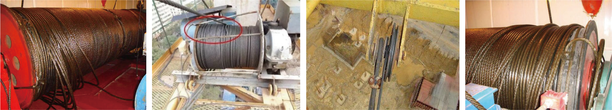 在實(shí)際操作中,鋼絲繩在卷筒上因偏角過大、預(yù)緊力不足、卷筒加工存在偏差等,導(dǎo)致鋼絲繩跳繩,排列不整齊。此外,起重機(jī)在工作中因吊鉤、吊具觸底過放,導(dǎo)致導(dǎo)向滑輪、定滑輪鋼絲繩跳繩問題,造成鋼絲繩磨損、破切隱患。