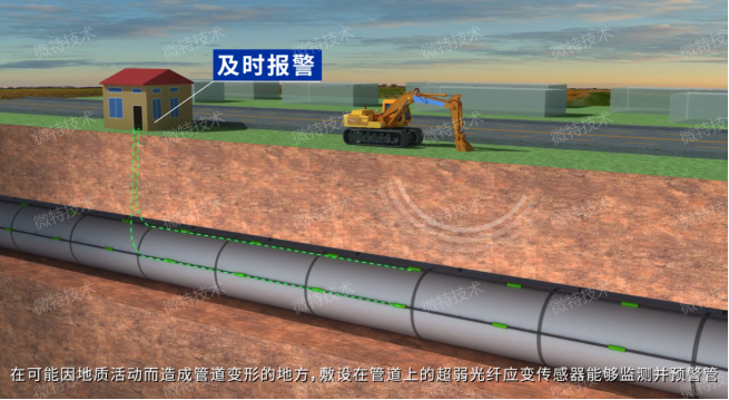 在敷設管道上安裝光纖應變傳感器能夠監(jiān)測并預警管道樞軸或屈曲的發(fā)展變化,同時以米級的定位精度通知閥室的管理人員。為了第一時間檢測出微小的泄漏,最大限度降低對環(huán)境的破壞,根據(jù)管道傳輸物質(zhì)的不同液體,溫度感測光纜對應敷設在管道的不同位置,通過監(jiān)測周圍土壤溫度的異常,來判斷管道是否發(fā)生泄漏,不管是泄漏引起的還是外界環(huán)境變化造成的都能即時發(fā)現(xiàn)。