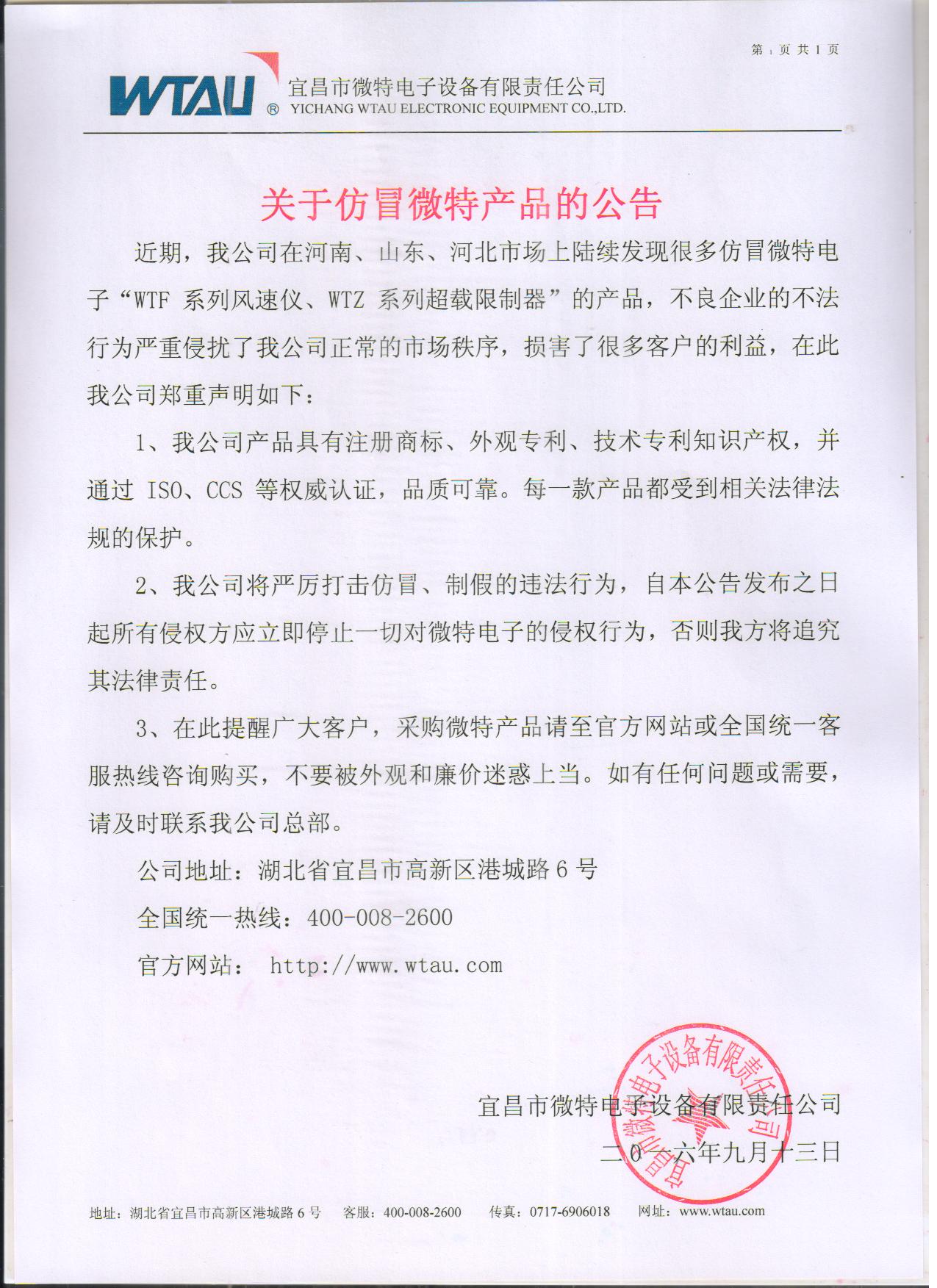 近期,我公司在河南、山東、河北市場(chǎng)上陸續(xù)發(fā)現(xiàn)很多仿冒微特電子“WTF系列風(fēng)速儀、WTZ系列超載限制器”的產(chǎn)品,不良企業(yè)的不法行為嚴(yán)重侵?jǐn)_了我公司正常的市場(chǎng)秩序,損害了很多客戶的利益,在此我公司鄭重聲明如下: