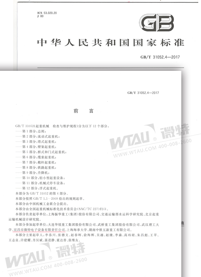這兩項(xiàng)標(biāo)準(zhǔn)分別是國家標(biāo)準(zhǔn)GB/T31052.4-2017 《起重機(jī)械 檢查與維護(hù)規(guī)程 第4部分:臂架起重機(jī)》和國家標(biāo)準(zhǔn)GB/T31052.12-2017 《起重機(jī)械檢查與維護(hù)規(guī)程 第12部分:浮式起重機(jī)》。此兩項(xiàng)標(biāo)準(zhǔn)將于2017年12月1日起正式實(shí)施。