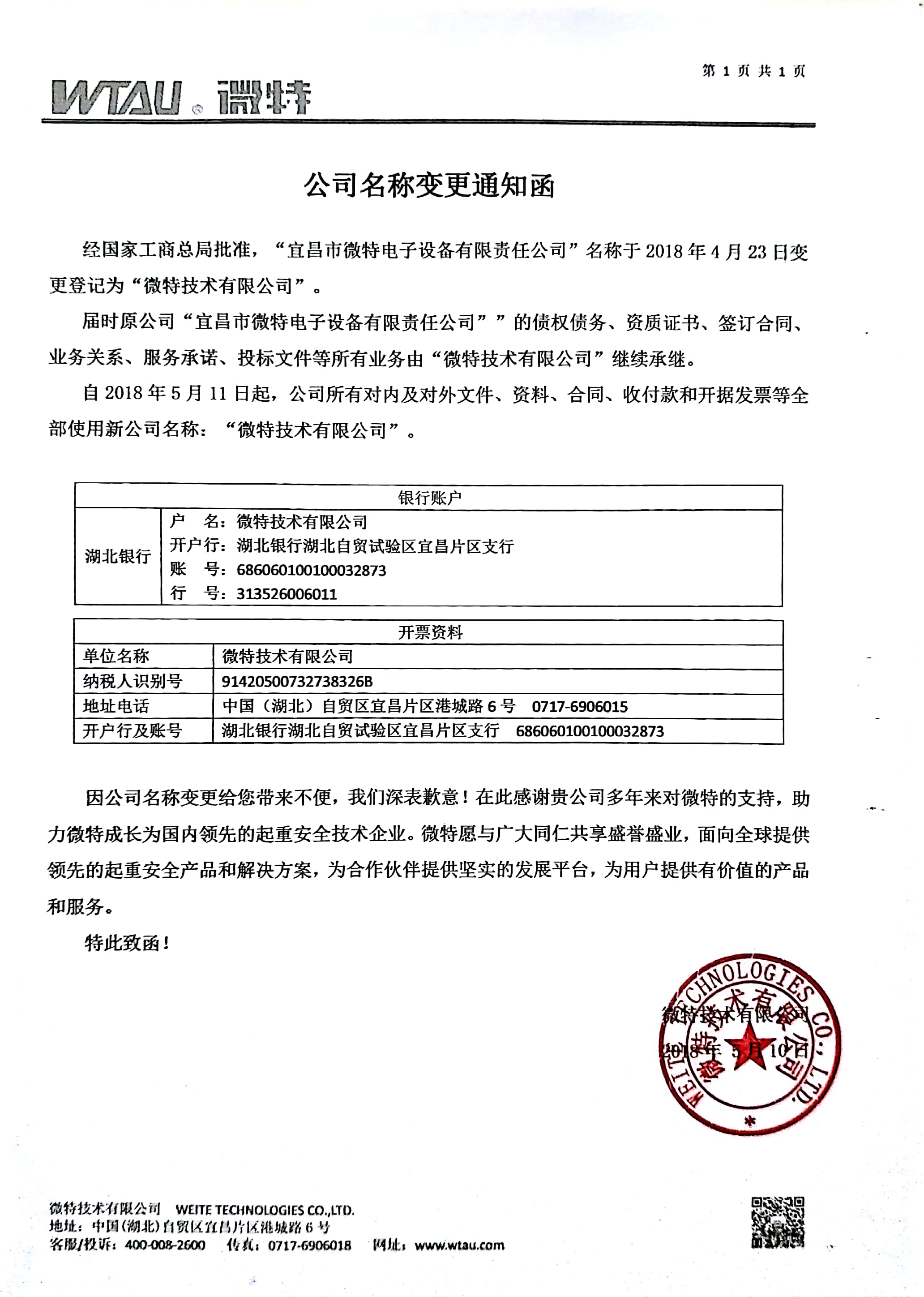 注:自2018年5月11日起,原公司“宜昌市微特電子設(shè)備有限責(zé)任公司””的債權(quán)債務(wù)、資質(zhì)證書(shū)、簽訂合同、業(yè)務(wù)關(guān)系、服務(wù)承諾、投標(biāo)文件等所有業(yè)務(wù)由“微特技術(shù)有限公司”繼續(xù)承繼。公司所有對(duì)內(nèi)及對(duì)外文件、資料、合同、收付款和開(kāi)據(jù)發(fā)票等全部使用新公司名稱(chēng):“微特技術(shù)有限公司”。