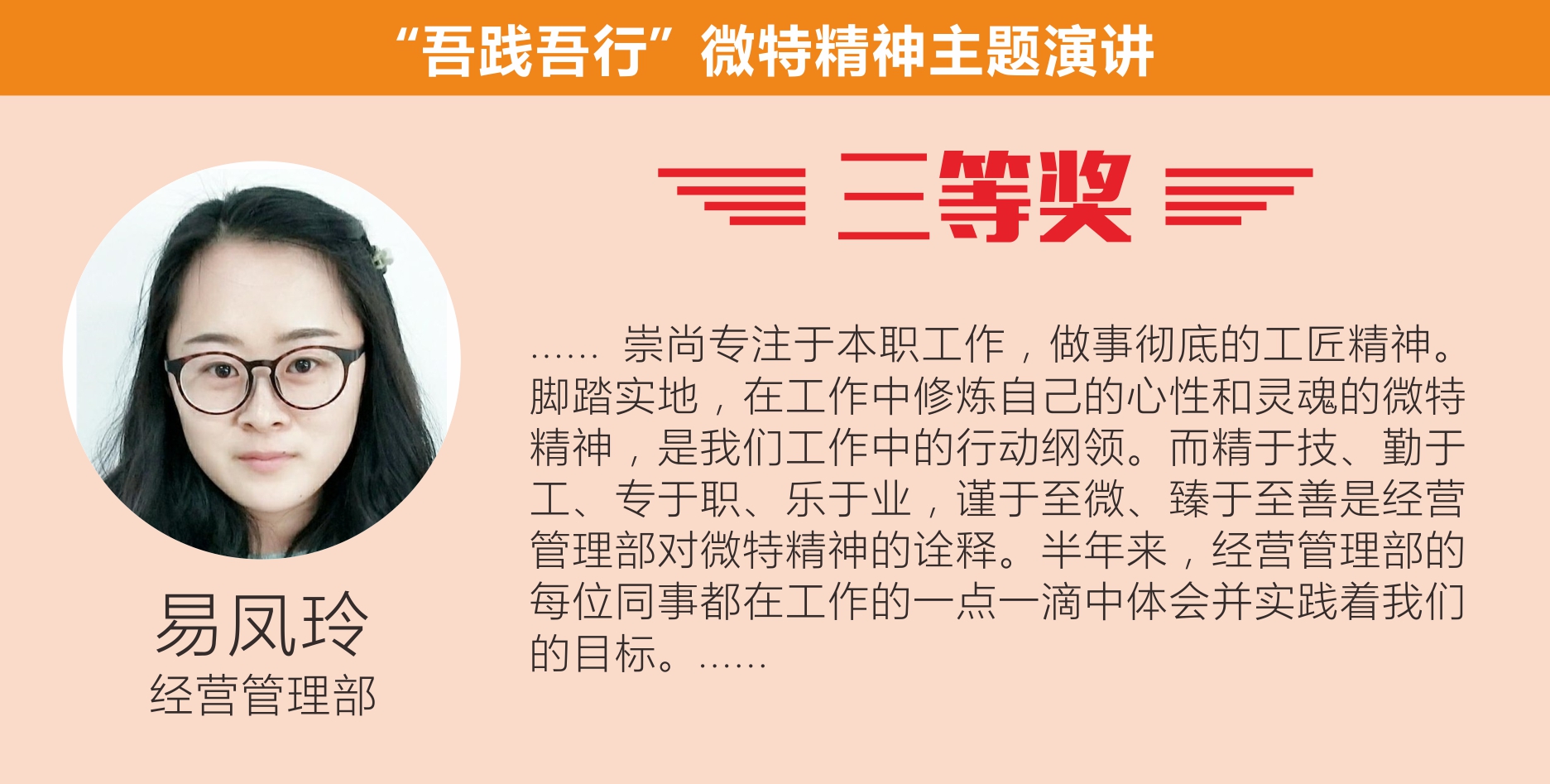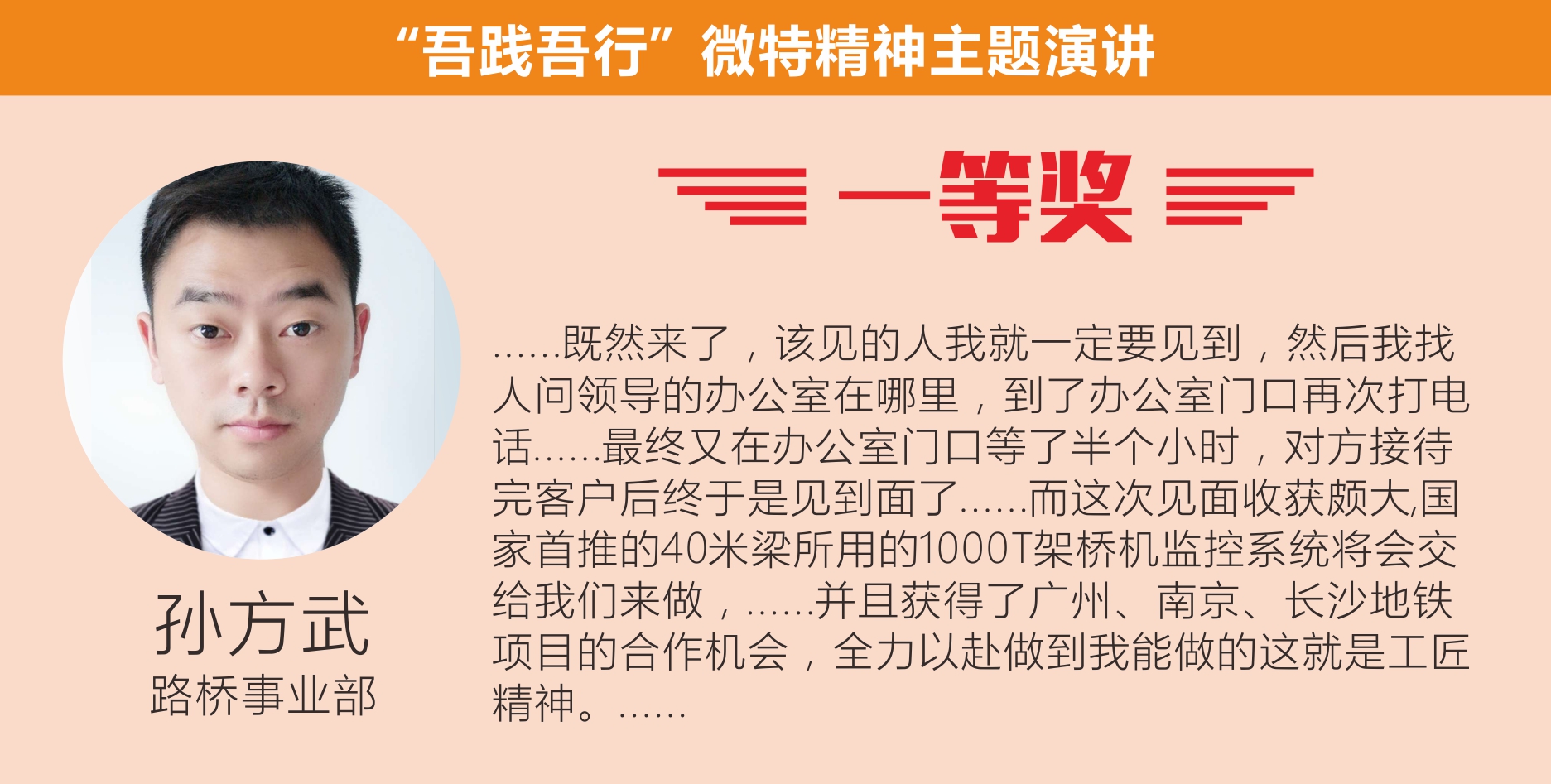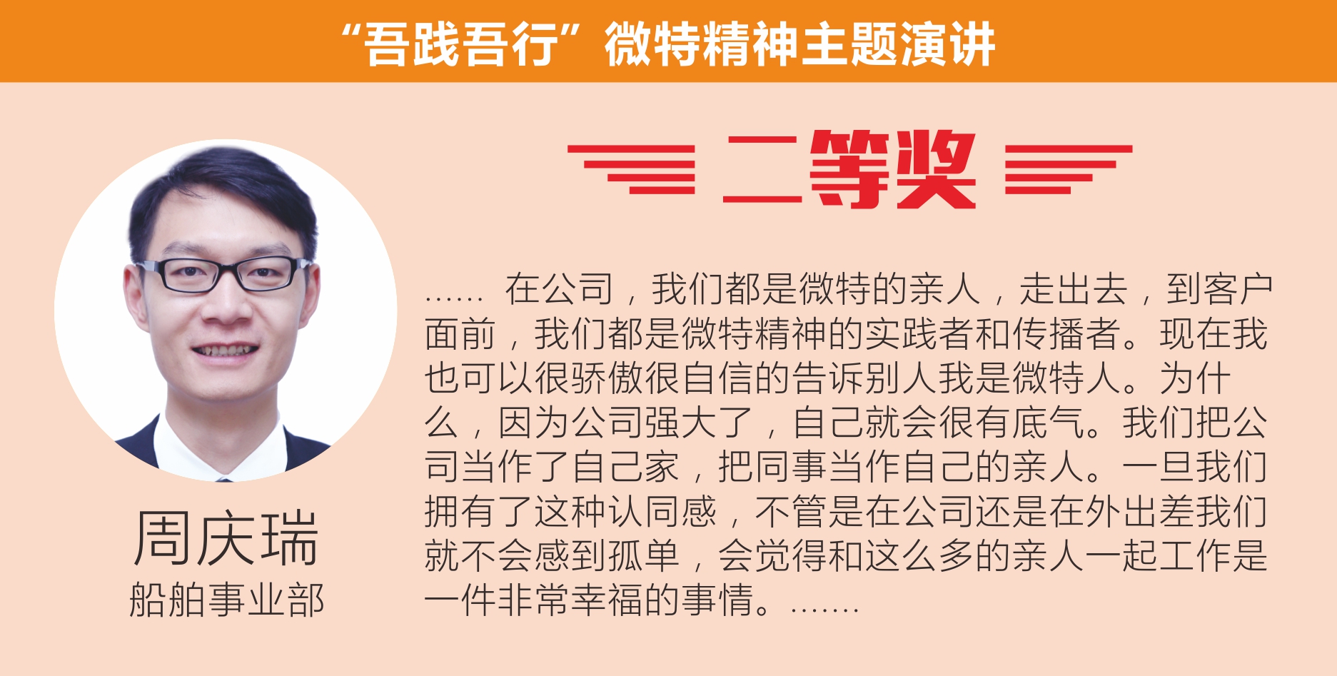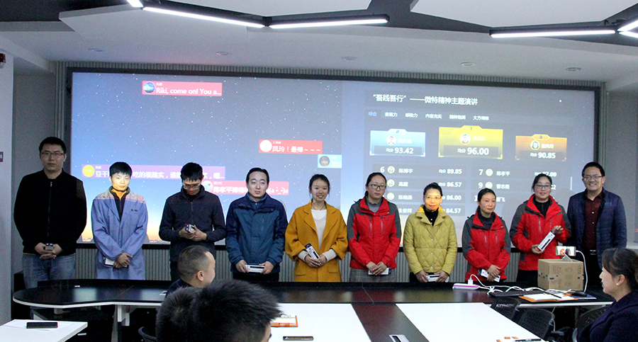 2018年11月17日,2018“吾踐吾行”微特精神主題演講賽在公司隆重舉行,總經(jīng)理聶道靜和各部門主管參加活動并做為評委對演講者評分。此次比賽在公司內(nèi)部全程網(wǎng)絡(luò)直播,很多出差在外的人員也可以與現(xiàn)場互動。此次活動各部門積極踴躍參與,優(yōu)選出12名參賽選手現(xiàn)場演講,選手們結(jié)合微特精神闡述了自己一年以來對工作的感悟和啟發(fā)。