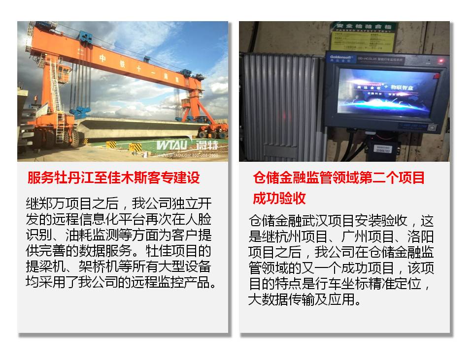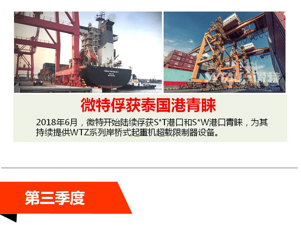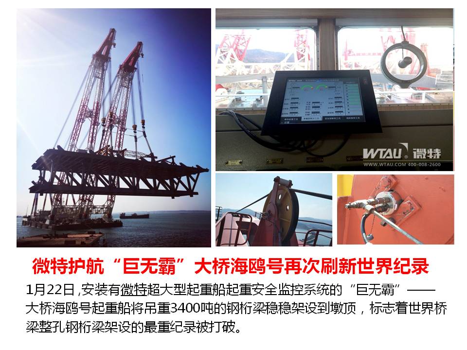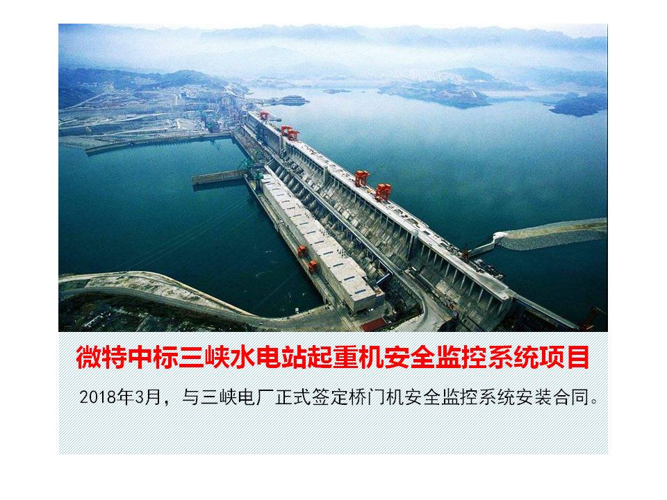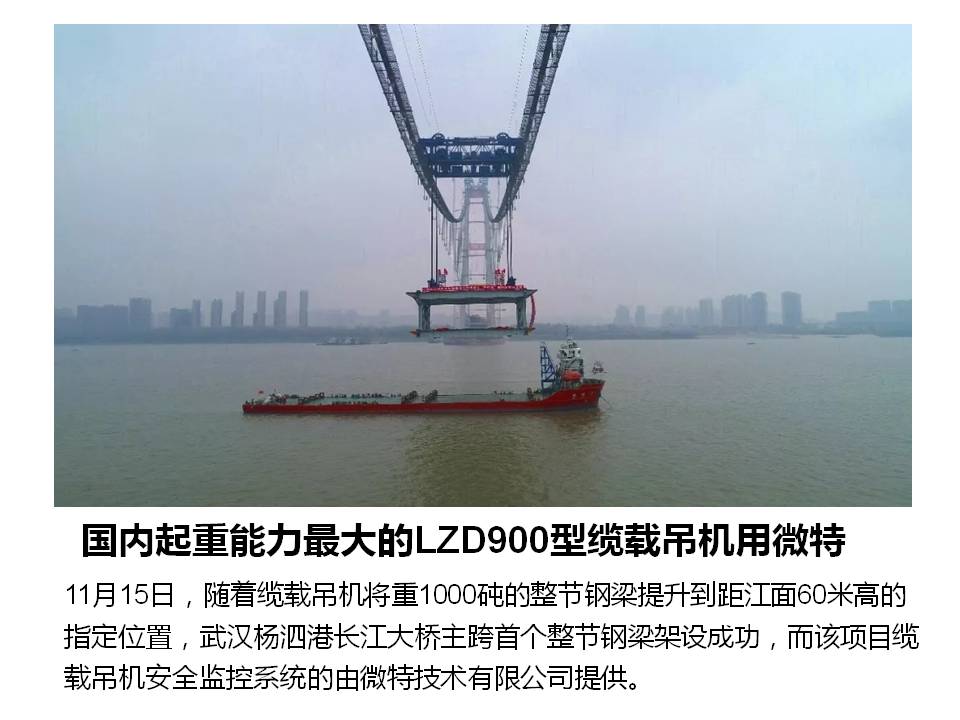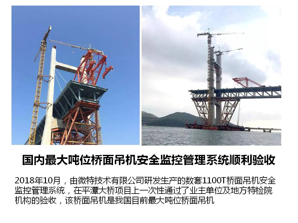 這一年,微特再次中標三峽電站的所有壩頂門式起重機和廠房橋式起重機的安全監(jiān)控系統(tǒng)升級改造;成功進入風(fēng)電裝備吊裝監(jiān)控、船用絞車安全監(jiān)控領(lǐng)域等;新的起重機施工過程點檢系統(tǒng)、防撞系統(tǒng)、壽命監(jiān)測系統(tǒng)投入使用。在大型裝備方面,2018年微特又摘獲數(shù)項中國起重機之最:國內(nèi)最大纜載吊機、最大的橋面吊、最大的廠房橋機安全監(jiān)控都采用微特產(chǎn)品,這再次證明了微特在大型重要起重機安全監(jiān)控方案的引領(lǐng)地位。