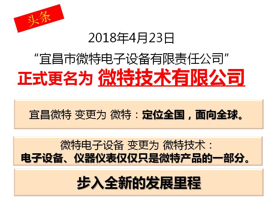 這一年,公司名由“宜昌市微特電子設(shè)備有限責任公司”變更為“微特技術(shù)有限公司”,新的公司名稱明確傳達了三點重要的企業(yè)理念:1、公司將定位全國,面向全球提供產(chǎn)品和技術(shù)服務(wù),立志做全球起重設(shè)備安全管理細分領(lǐng)域的領(lǐng)導(dǎo)者。2、微特是一家從事起重機安全管理解決方案的技術(shù)服務(wù)商,通過不斷的技術(shù)創(chuàng)新保障起重機運行安全高效是微特人的使命。3、微特步入全新的發(fā)展里程。