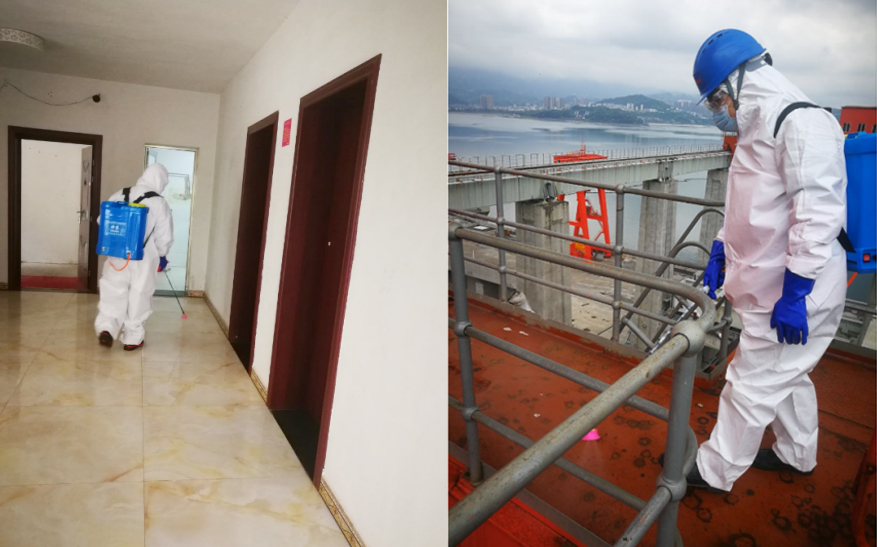 ▲施工前對(duì)生活營(yíng)地和施工現(xiàn)場(chǎng)設(shè)備進(jìn)行消毒