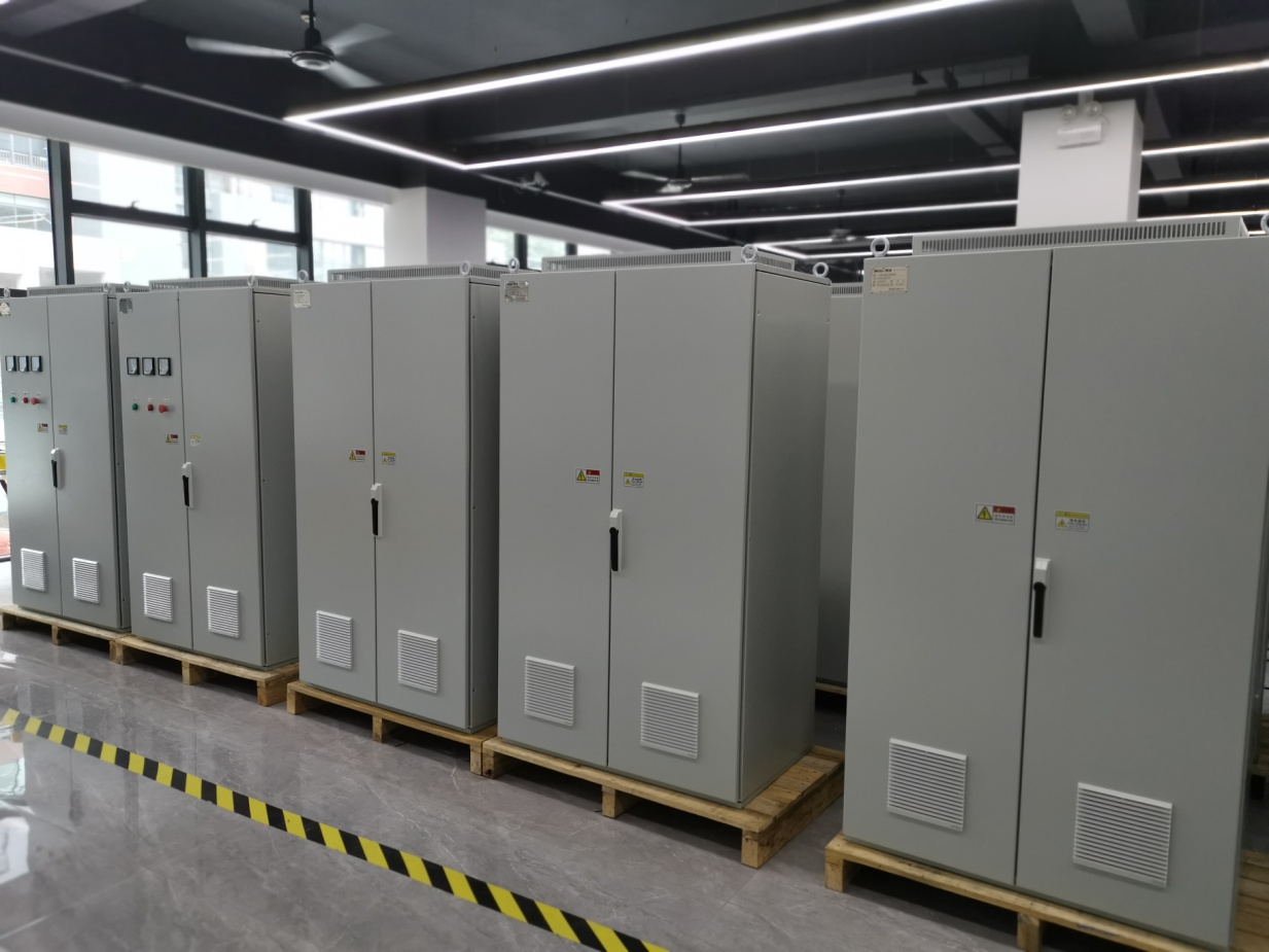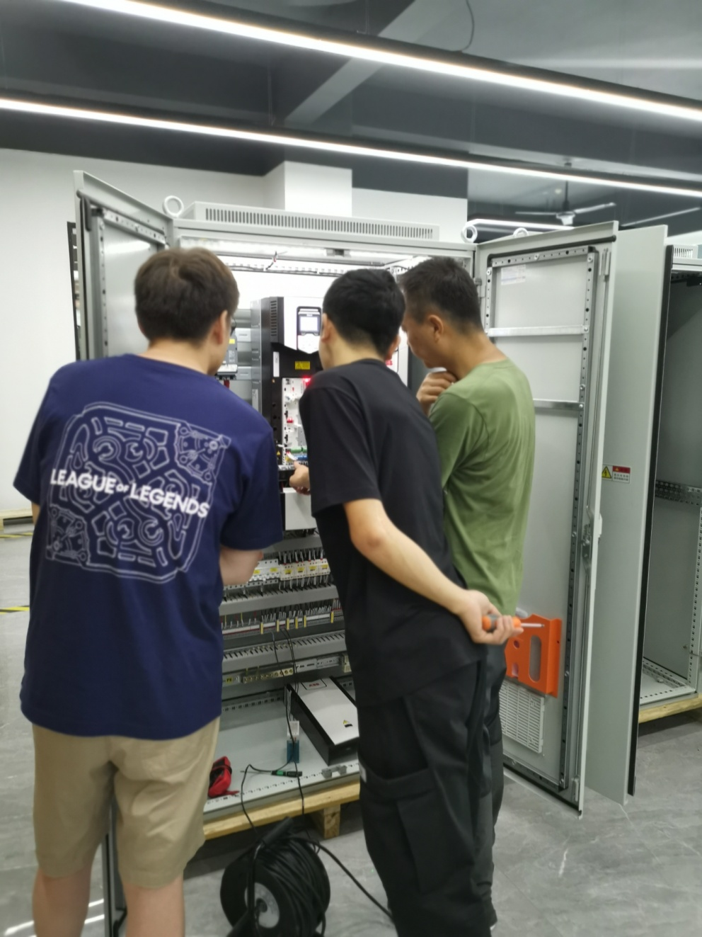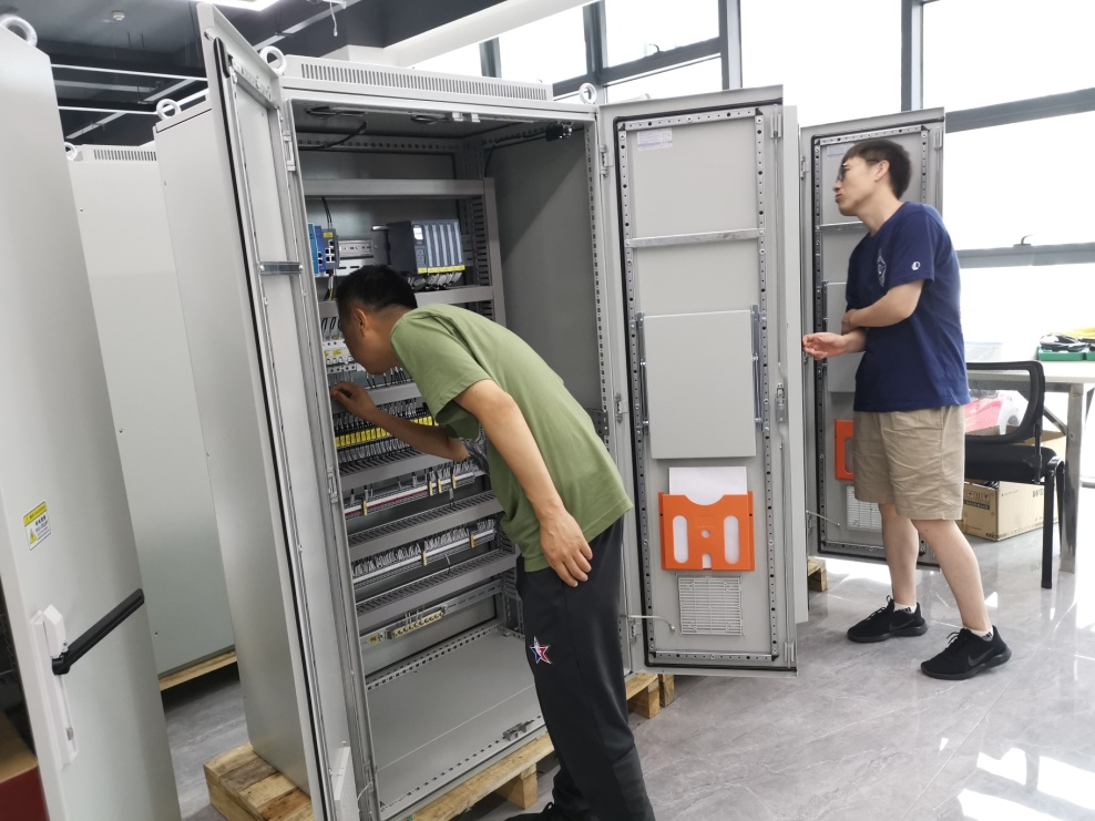 大朝山電站驗(yàn)收代表在微特電氣車間檢查盤柜生產(chǎn)工藝以及微特電氣工程師對變頻控制柜進(jìn)行上電試驗(yàn)