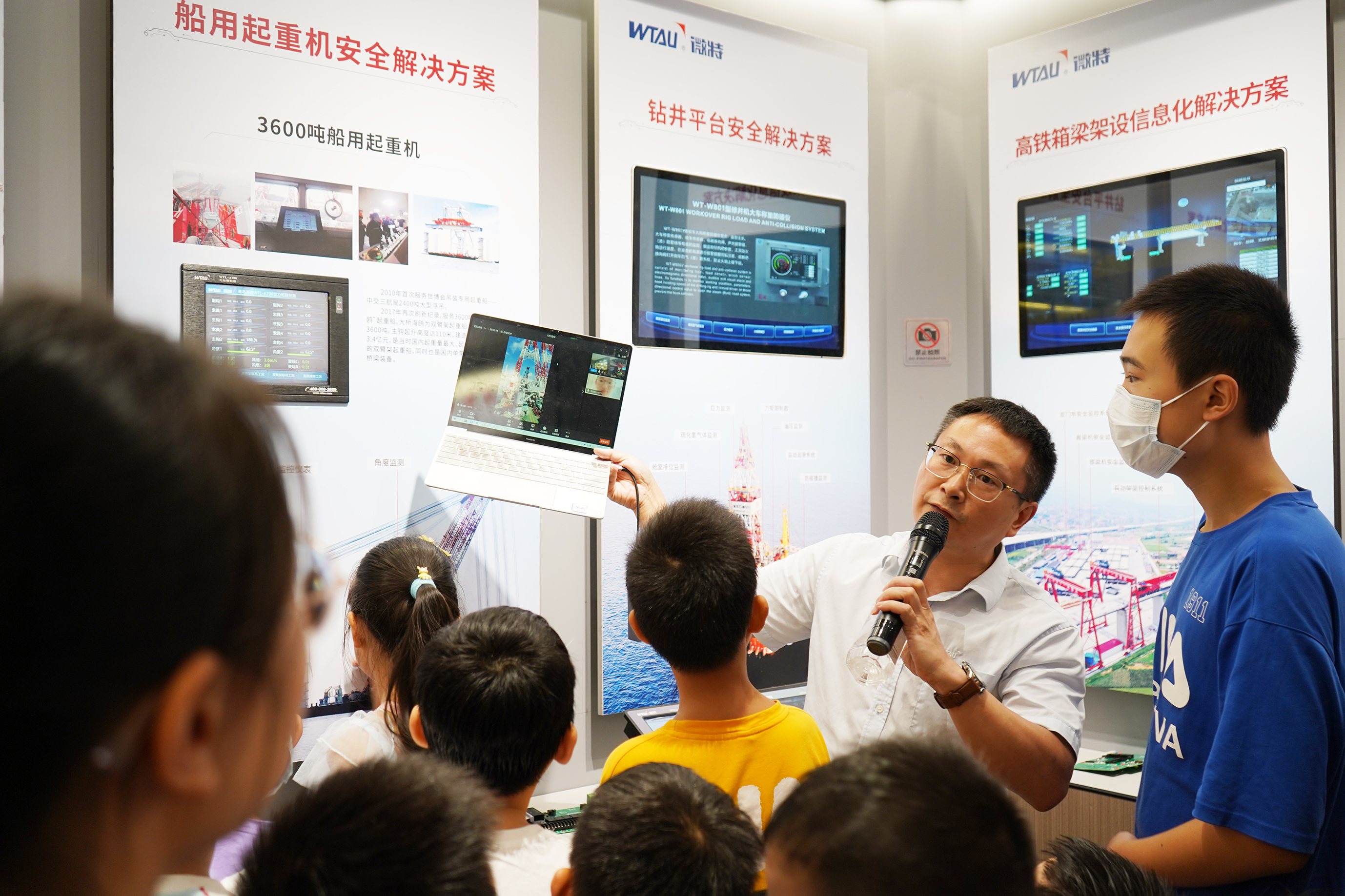 在現(xiàn)場參觀的過程中小朋友們通過微特研發(fā)的智能監(jiān)控系統(tǒng),與正在中鐵大橋局承建的世界首座公鐵同層多塔斜拉橋——珠海珠機城際金海大橋項目現(xiàn)場出差的曹工視頻連線并進行互動,這個項目現(xiàn)場的鋼塔吊裝設備“大橋海鷗”號3600噸起重船所配裝的正是微特智能監(jiān)控系統(tǒng)。視頻中曹工的聲音一響起,現(xiàn)場孩子們一片歡呼雀躍嘰嘰喳喳的說著“太神奇了”,這也激起孩子們的好奇心,各種奇思妙想接踵而至。