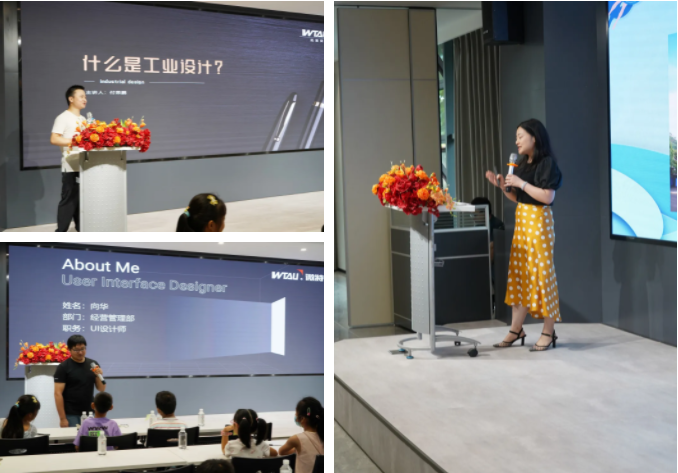第三站在工業(yè)設計中心會議室,由微特工業(yè)設計師、UI設計師以及外貿(mào)銷售的三位老師分別為孩子們介紹什么是工業(yè)設計?UI是什么?以及外貿(mào)是怎么做的?讓孩子們感受到了未來的多樣性,也希望通過這些演示啟發(fā)孩子們,讓他們找到自己真正的興趣所在,在今后的學習中能夠找到為之努力的方向。