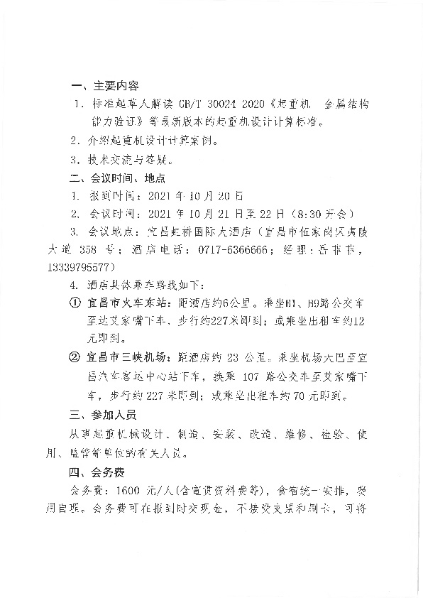 原定于2021年8月18日至19日在宜昌召開的全國起重機械標準化技術(shù)委員會組織的關(guān)于GB/T 30024-2020《起重機 金屬結(jié)構(gòu)能力驗證》等起重機設(shè)計標準宣貫會,由于疫情原因進行了延期。經(jīng)組委會研究決定將于2021年10月20日至22日仍在宜昌召開此次會議。
