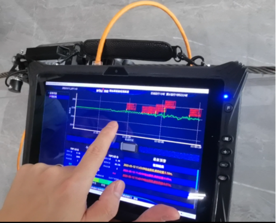 面對(duì)考驗(yàn),微特技術(shù)工程師迅速行動(dòng),采用便攜式鋼絲繩在線監(jiān)測(cè)系統(tǒng)進(jìn)行檢測(cè)。設(shè)備快速且精準(zhǔn)地完成任務(wù):現(xiàn)場(chǎng)共檢出10處損傷,其中嚴(yán)重?fù)p傷達(dá) 6 處,并生成了詳細(xì)的檢測(cè)報(bào)告。這一結(jié)果充分展現(xiàn)了微特鋼絲繩檢測(cè)產(chǎn)品對(duì)內(nèi)部斷絲、局部磨損等缺陷強(qiáng)大的識(shí)別能力,完美驗(yàn)證了其技術(shù)的有效性與可靠性。
