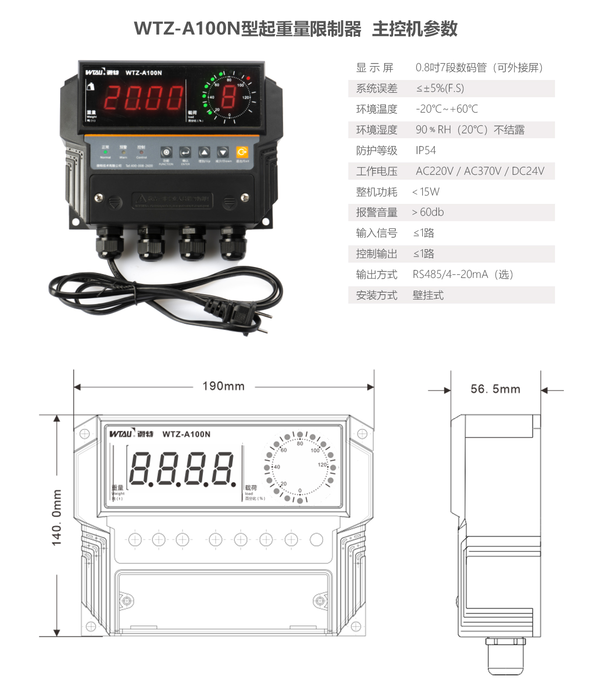WTZ-A100N起重量限制器采用紅色0.8吋超大7段數(shù)碼管,雙窗口顯示,可外接大屏。儀表設(shè)計為單片機控制,全按鍵提示符操作。