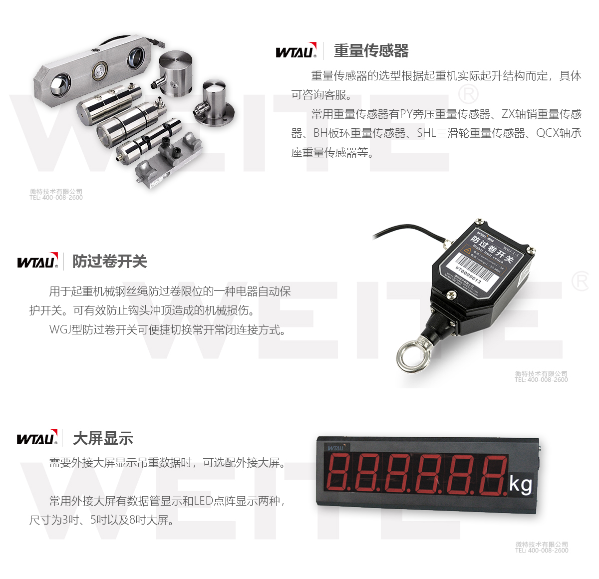 WTZ-A200起重量限制器由主機(jī)儀表,重量傳感器,防過(guò)卷開(kāi)關(guān)(選配),外置大屏(選配)以及電源信號(hào)線纜等組成。