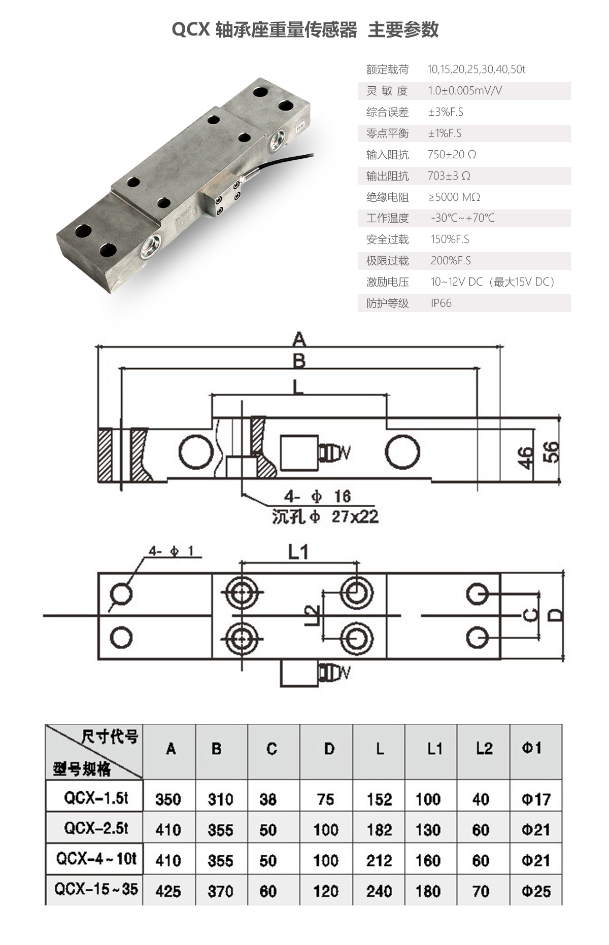 QCX軸承座重量傳感器主要安裝于軸承座下,也可以用在其它結構形式下,是用于測量壓力的一種傳感器。