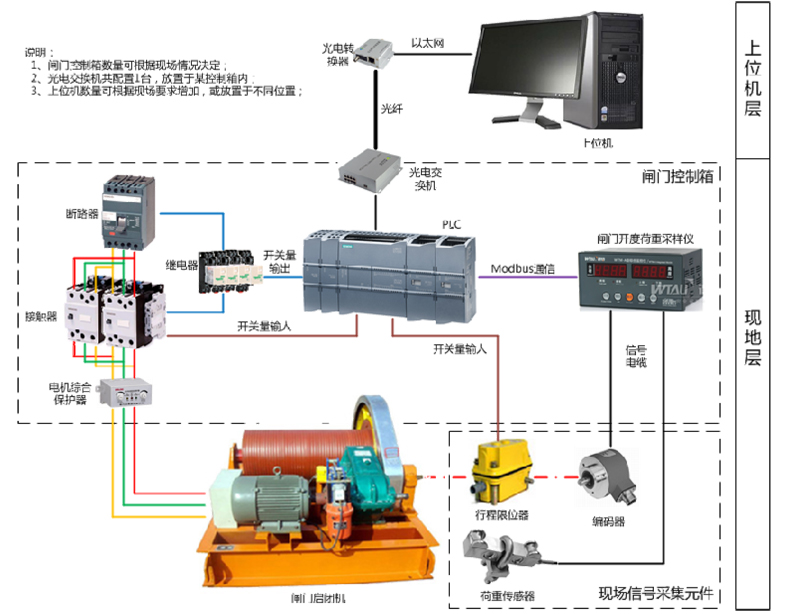 控制系統(tǒng)采用分層分布式結(jié)構(gòu),整個系統(tǒng)分為兩層,上層為中控室監(jiān)控單元、下層為現(xiàn)地操作單元。實現(xiàn)對所有閘門的監(jiān)視、控制;現(xiàn)地層以PLC為主控元件實現(xiàn)控制。根據(jù)閘門數(shù)量配置控制箱,每扇閘門各配置1臺控制箱,放置于被控閘門啟閉機旁。既可在上位機實現(xiàn)對閘門的遠程監(jiān)控,亦可通過控制箱上的按鈕對閘門進行現(xiàn)地操作。