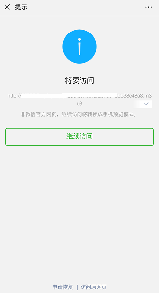騰訊云放回的m3u8地址是一個(gè)直播的視頻流地址,直接播放會(huì)在微信頁(yè)面有一個(gè)【繼續(xù)訪問(wèn)】的頁(yè)面提示;