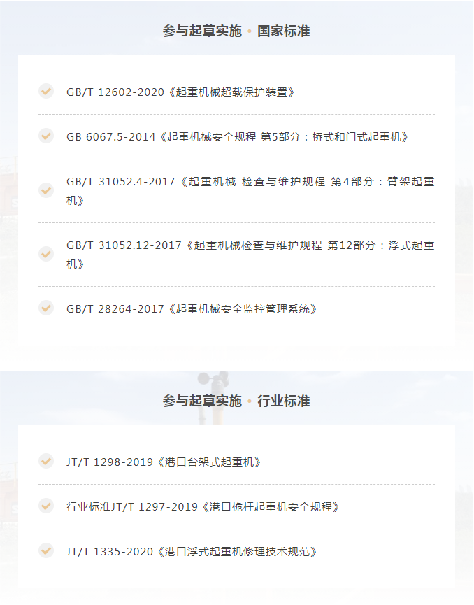 2019年9月微特當(dāng)選全國起重機標(biāo)委會臂架分會委員會委員。2020年10月1日由微特牽頭起草的國家標(biāo)準(zhǔn)GB/T 12602-2020《起重機械超載保護裝置》正式實施,這也是微特參與起草并發(fā)布實施的第5項國家標(biāo)準(zhǔn)。截止到目前微特先后參與了20多項國家標(biāo)準(zhǔn)的起草,其中5項國家標(biāo)準(zhǔn)及3項行業(yè)標(biāo)準(zhǔn)已頒布實施。