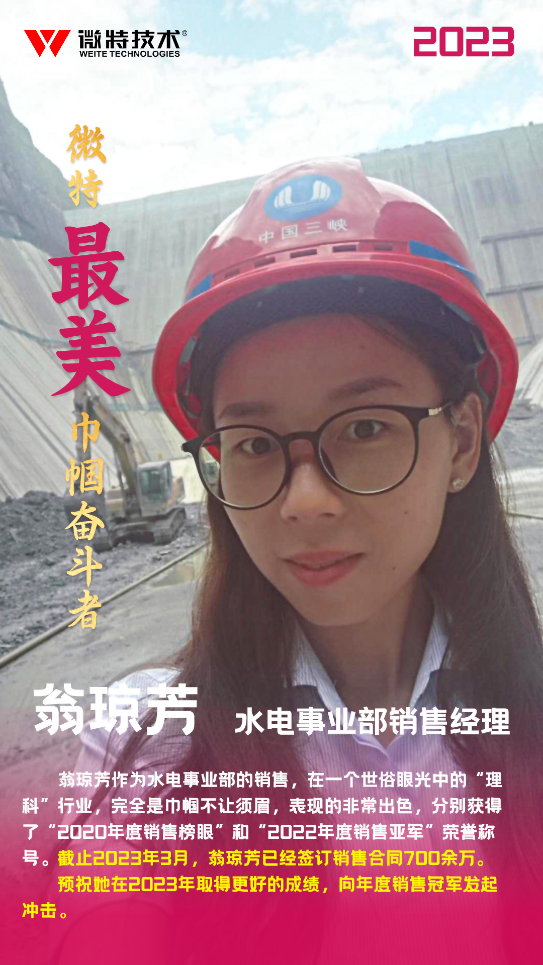 我想起微特公司 “一直致力于為客戶提供有價值的產(chǎn)品和服務(wù),為客戶提供更加安全可靠的解決方案”的理念與宗旨,原來已經(jīng)潤物細無聲的浸透到每一位微特人的骨子里。而翁瓊芳作為水電事業(yè)部的銷售,在一個世俗眼光中的“理科”行業(yè),完全是巾幗不讓須眉,表現(xiàn)的非常出色,分別獲得了“2020年度銷售榜眼”和“2022年度銷售亞軍”榮譽稱號。截止2023年3月,翁瓊芳已經(jīng)簽訂銷售合同700余萬,我也預(yù)祝她在2023年取得更好的成績,向年度銷售冠軍發(fā)起沖擊。